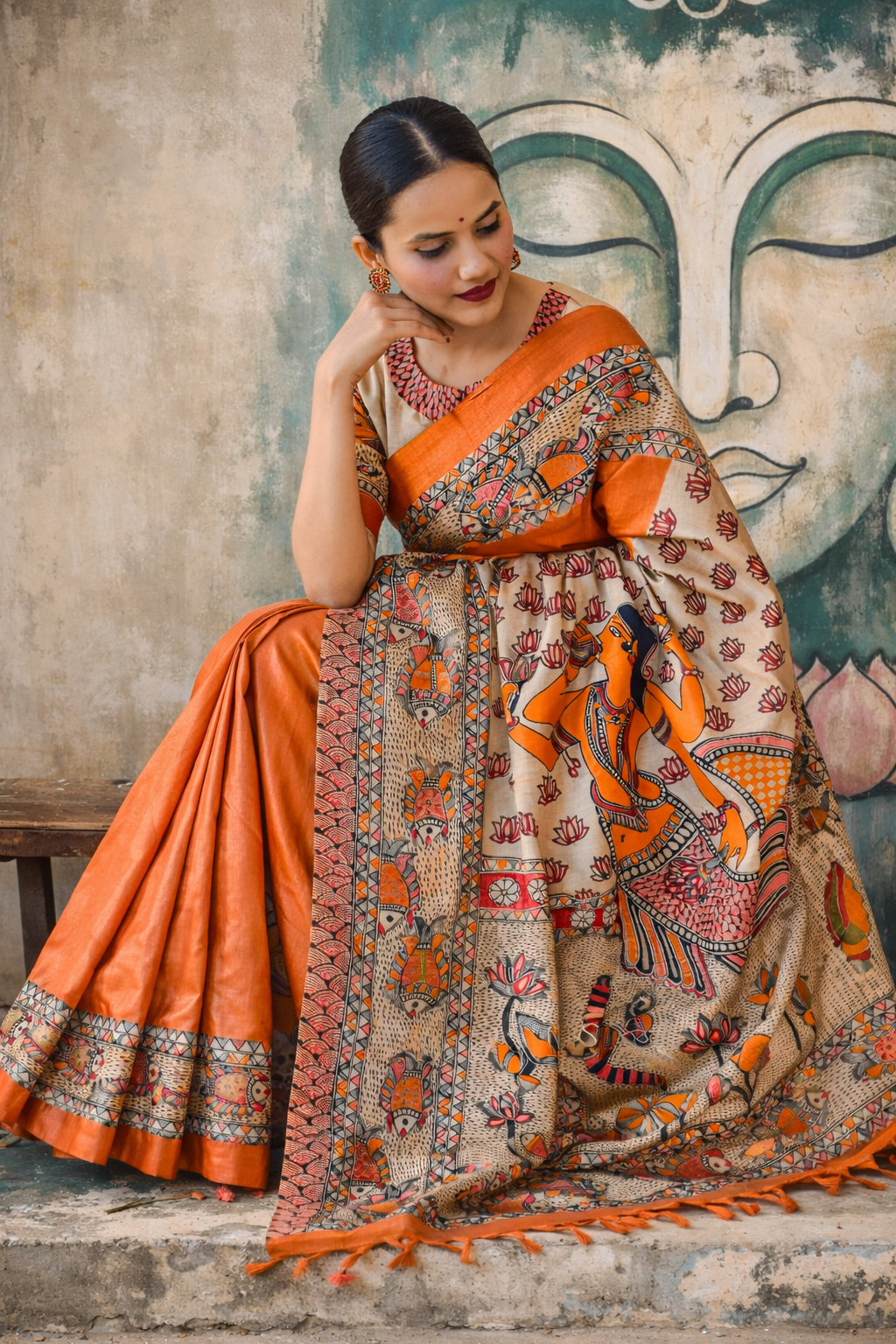 Handwoven Bhagalpur silk with ceremonial drape and traditional weave character.